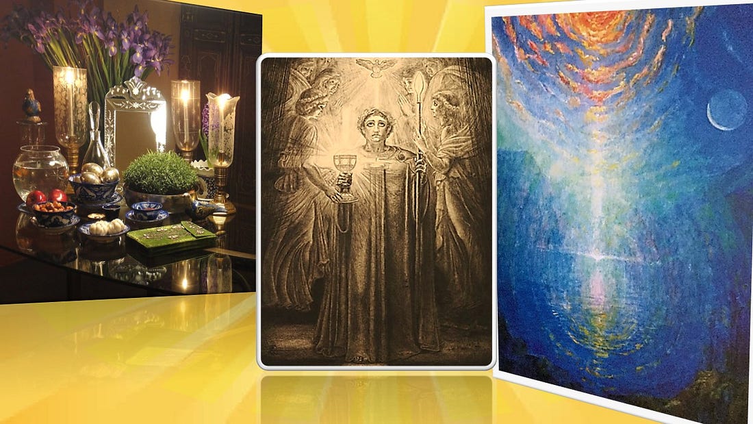 The physical rays of the Vernal Sun shine now on the waxing crescent Moon to reveal a gold-gleaming sickle. Within this vessel rests the dark Host - The spiritual power of the Sun. The Spirit of the Sun - rests in the Moon-cup - The Host renewed - is descending once again from the Cosmos into the Grail – Becoming a rejuvenating cauldron providing nourishment for the Earth during this Lenten/Passion-Tide - Preparing us for the Easter fest – when we – the holy human Fool, wait to be reborn as the Parzival. And so it is that Today on this Vernal Equinox - The light & the dark stand side by side in sweet equipoise waiting for the Grail Moon to rise. Today is Nowruz (New Day) the Iranian/Persian New Year - rooted in the traditions of Mitraism & Zoroastrianism holding a deep relationship with the power of the Sun, the ork of good & evil in the world, & the connection of the human being to Nature. Long before modern civilization emerged, the people of Persia welcomed the arrival of Spring with a celebration that symbolized renewal, hope, & the triumph of life over death. Nowruz is not only the beginning of a calendar year, for Iranians, it represents continuity, identity, & resilience. At the heart of the Nowruz celebration is the Haft-Sene table, a symbolic arrangement of 7 elements beginning with the Persian letter “S” - representing an aspect of life & renewal: • Sabzeh (sprouts) – rebirth and renewal Alongside these symbolic items, many families also include: • A mirror For many Iranians today, especially in the diaspora, the image of the Prophet Zarathustra & the historic Lion & Sun flag of Iran have also become a powerful symbols to place beside the Haft-Sene. It represents their heritage, & the enduring spirit of the people – a reminder that: No winter lasts forever. Spring always returns. Another meaningful addition is the book of Saadi, one of the greatest poets in Persian literature. Saadi’s message of human unity continues to resonate across centuries. His famous lines, engraved at the entrance of the United Nations, capture the spirit of humanity: Human beings are members of a whole, ~Will you - Sow the seeds of peaceful premonition - Into a fruitful action - To ignite the weave - In radiant expectation…? ~hag Spring Equinox Activation - Friday 20 March 2026 -3 pm – Biodynamic Prep stirs - We will be doing a 20-minute activation of the Barrel Compound (BC) which contains all the compost BD preps – allowing their powerful effects to be combined into a potent bouquet. We will also do an hour stir of BD 500 to improve soil structure & microbial activity. During this hour we will also do some group Eurythmy, w/Hazel & Petra, & engage in Tone Sounding, w/ Gail Sauter. Petra Zinniker has been making Biodynamic Preparations on Zinniker Farm for many years. If you would like to purchase some of these healing substances to help strengthen the life forces of your home garden or farm, fill out the form on the web page https://www.zinnikerfarm.com/biodynamics 4 pm - ‘Beating the Bounds’- Those who are willing & able can opt to bless the land spraying the BD preps - Nourishing & gifting the soil & the Elementals. 5:30 pm - Potluck inside the Spirit Lodge - Please Bring Food & Drink to Share. Hazel will make a Zinniker Roast. 6:30 pm – Bonfire - Song Circle with Ultra-Violet ArcherCome for all or part of the event - Dress for mess, mud boots & happy layers RSVP Hazel@CogRite.com for directions To honor & foster the Christian Community of Southeast Wisconsin, interest has been building to have regular ‘Devotional Gatherings’ in-between Priest Visits. All are welcome to gather on select Sundays 10:30 – 11:30 am so that we can tune into the time when the Consecration of the Human Being is being celebrated all over the country. 22 March 26 April At the ‘Spirit Lodge’ in Elkhorn WI. RSVP for directions Hazel@CogRite.com If you want to support the Spiritualization of the Earth thru the Biodynamic Farming done on Zinniker Farm, you are invited to become a paid subscriber to Cognitive Ritual: Confessions of a Modern Rosicrucian, with all donations going directly to the farm Here’s the link to a compendium of Free Video PresentaionsThe Cognitive Ritual is a Free Will Offering to All worlds. Please Share freely Greetings Friend, you currently a free subscriber to Cognitive Ritual. Thank you for receiving my workings freely offered. For the full experience, upgrade your subscription. ALL donations go to support Zinniker Farm - The oldest Biodynamic Farm in America! Together we can spiritualize the Universe. XOX ~hag |