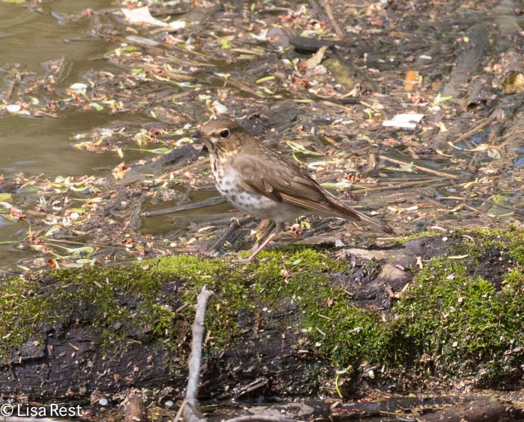 A Swainson's Thrush barely stands out against a muddy-looking background.