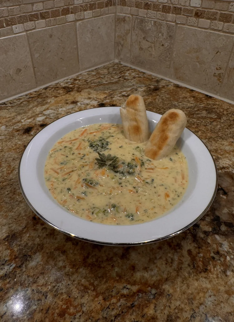 | Welcome to Soups and Sides, where each month we take a deep dive into the history and recipes of various soups and sides. This month's soup recipe is based on Panera's broccoli cheddar soup, with a few extra touches that makes it a Blueprint special. Broccoli cheddar soup was created in the 1990s after President Bush publicly declared his hatred for broccoli, shortly after Campbell's release of cream of broccoli soup. In response, Campbell's launched a campaign titled "How to Get President Bush to Eat Broccoli," inviting customers to send in their revolutionary home recipes using Campbell's cream of broccoli soup. Made with a creamy, cheesy base and warm, aromatic spices, Priscilla Yee's broccoli-cheddar soup won the competition. Campbell's partnered with Yee and used her recipe as an inspiration to create canned broccoli cheddar soup, a world-rocking revelation that forever changed the meaning of soup for innumerable years to come. Ingredients: 1/4 cup butter 1/2 medium chopped onion 1/4 cup flour 2 cups half-and-half cream 2 cups low-sodium chicken stock or broth 1/2 lb broccoli (about 3 cups), chopped into bite size pieces 1 cup carrot, julienned (can buy matchstick carrots in produce section) 1/8 tsp nutmeg, (optional but brings out the flavor) 8 oz grated sharp cheddar cheese (and more for snacking) Salt and pepper (to taste) 1/4 tsp turmeric Bread to dip (optional) Instructions: Melt the butter and sauté the onions on the stovetop until soft. Sprinkle the flour over the mixture. Cook and stir over medium heat for 1-2 minutes. Whisk in the half & half and chicken broth. You can also use heavy cream. Add the broccoli florets and carrots. Cook over medium-low heat for 20-25 minutes or until the broccoli and carrots are tender. Add salt and pepper. You can leave soup chunky or blend about 1 cup of the soup with an immersion blender and stir it in for a smoother soup. Return to low heat and add the cheese. If your heat is too high your soup can get grainy. Stir in the nutmeg and turmeric if desired. Optional: serve with crusty bread. |