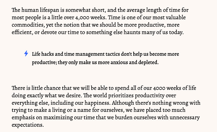 4000 Weeks — A Lifespan & The Trade Off Between Time & MoneyYou’ve probably heard this a lot, but you need to understand how little time you haveThere’s this pretty famous song by the Britpop band The Verve that goes, “It’s a bittersweet symphony, that’s life. Trying to make ends meet, you’re a slave to the money, then you die.” It’s a pretty cathartic & grim bit of songwriting, but a groovy song nonetheless. “I don’t have the time,” or in Hindi, “mere paas time nahi hai”, you’ve probably heard people say this all the time, but what are they or you truly spending your time on? There’s also the “time is money” proverb, but ‘time’ is worth much more than trading it off inconsequentially for or in search of money. You may have heard that time is your most valuable resource… a lot, but until it hits you & you truly understand how little time you have, you’ll keep squandering it away. I saw this interesting quote in a video by Brian Cox, a theoretical physicist I follow, where he talks about the insignificance of us living our finite lives here on Earth in a potentially infinite universe. It, of course, echoes Carl Sagan’s legendary Pale Blue Dot analogy, that we’re entirely insignificant in the larger scheme of the universe. But what I liked about Cox’s video is that he talks about our capacity to think, & while that may seem inconsequential, we’re possibly the only species in the universe to understand, comprehend, & make sense of this experience, in a universe comprising 2 trillion galaxies(or more). But apart from feeling fleetingly special about yourself, and our self-centred living, which, in essence, is the ‘ego’ or the ‘I’, often the point of discussion of a lot of Eastern spirituality, you need to understand how little time we have as human beings in the timeframe of a lifespan. 4000 Weeks — The Average LifespanI was doing my weekly reading on my Headway app, a book summary app I use to do my reading. And while I was browsing through titles, I stumbled upon this book by Oliver Burkeman titled Four Thousand Weeks: Time Management For Mortals — Time and How to Use It. It outlined how we have only 4000 weeks to live, which is the average lifespan for human beings. It quantified the shocking yet blunt truth that that’s all the time you have to live, give or take — 4000 weeks. I’ve always known that life is short, but I didn’t run the math converting 76 years into weeks. 4000 weeks is the average lifespan for human beings, assuming you live until you mid 70s. Analysing Burkeman’s analysis: Here are some of the key takeaways from the book: i) The obsession with being productive has made it difficult for people to appreciate family & personal timeIt’s common knowledge & experience that the work week takes up most of our time & attention. However, in the larger picture in the timeframe of existence, the question that often pops up is, “Does it truly matter?”. Society’s obsession with being productive & cranking down several work tasks every day of the week often leads to us missing the entire point, i.e. the time we spend with our family and our personal time. Burkeman’s analysis suggests that we need to prioritise our family & personal time & keep everything else secondary. We need to keep family time & personal space at the top of our weekly agenda, because essentially that’s what matters the most in the fragile timeframe of a lifespan, he argues. ii) The best way to make the most of our time is to spend it doing the things we love