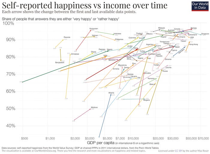 The Easterlin Paradox In Economics — Why GDP Growth Doesn’t Make Societies HappierAn essay examining the Easterlin Paradox and its implications for economic growth and societal well-beingIt’s past midnight in Mumbai city, the financial capital of India, and the city author Suketu Mehta dubbed the ‘Maximum City’ in his book Maximum City: Bombay Lost & Found, which I read several years ago. The air is a bit thick but chilly for the start of January 2026, & I’m halfway through writing an idea for a part of a short film score, but I didn’t want to overwork & rush myself on it. So I decided to write this short essay on the Easterlin Paradox, which was something I came across while doing my reading online recently & which I briefly studied & did a minor deep dive into. Here’s my brief essay on the subject, delving into the nuances and implications that emerge from the Easterlin Paradox. The Premise of the Easterlin ParadoxIn the mechanics of mainstream economics, when a country’s overall income rises, it should ideally translate to higher welfare. The Easterlin Paradox combines classical and behavioural economics to paint a clearer picture. Higher GDP per capita means greater consumption capacity and improved living standards, which should lead to greater happiness & societal well-being. However, the Easterlin Paradox exposes a structural anomaly in this assumption, challenging the narrative that linear growth in GDP leads to linear growth in happiness and well-being. First postulated by Richard Easterlin in the 1970s, the paradox observes that while within a country, at a given point in time, richer individuals tend to report higher subjective well-being, over the long run, as countries become wealthier, average happiness levels remain largely flat. This contradiction sits at the heart of modern happiness & welfare economics.