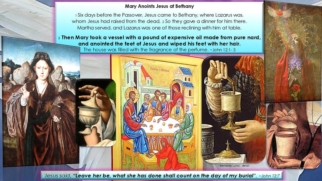 Congratulations – you have made it to the mid-point of Holy Week - On this the Full Paschal Moon where the April Fool meets Ostara the Goddess of Spring - reminding us that ‘The Best Fool is the Fool for Love’ Wednesday, is Mercury Day, & Today we meet the Mercurial figures of Lazurus, Mary Magdalene, Martha & Judas. Towards evening a scene unfolds in the quiet town of Bethany, beyond the Mount of Olives, where not too long ago the scene of the raising of Lazarus took place - The ‘miracle’ that pushed the authorities into murderous action. Lazarus along with the disciples of Christ are gathered round his table - Lazarus who has earned the title John - ‘The one whom Jesus loved’ - the one described as resting on the heart of JC at the Last Supper on Maundy Thursday. Martha & Mary Magdalene, are the sisters of Lazarus-John, it is in their ancestorial home that they have gathered. Each one of these 3 has had their own specific karmic event - bringing a radical transformation in the fulfillment of their life’s destiny. For Lazarus it was the awakening from the grave – the 1st Christian Initiation outpicturing the redemption of the physical body, & the coming in of new “I” forces, thru the spirit of John the Baptist, who was working with him across the threshold, as well as the Magdalene who held the sacred space during his descent. For Mary Magdalene, Myrrhophores, & former Priestess of Isis, it had been the freeing & purifying of her astral body, with the casting out of the 7 demons. The long-suffering Martha is said to be the woman who was healed of the issue of blood. Thru the Christ, her etheric formative forces were restored. As they all sit at the table with the disciples, Mary Magdalene anoints the feet of Christ with precious spikenard ointment, wiping his feet with her hair. Spikenard is a sacred oil used for thousands of years by Death Doulas, as a spiritual tool to assist in bringing a clarity of self-reflection to those about to cross the Threshold. The scent is described as an evocation of the perfume of the lost Garden of Eden – It is sacred to the Planet Venus, & the honeybees, & is associated with the Crown Chakra. Nard oil has strong, warm, musky notes, similar to the aroma of healthy earth. This oil inspires right deed & harmonizes the relationship between heaven & earth. St John’s Gospel says that the whole house was filled with this heady mystical fragrance. Mary Magdalene had performed a similar act a year & a half previously. But what does her act of anointing signify now? It is a sacramental act – the fulfillment of the ‘Rite of Last Anointing’ performed right before death. And yet, the solemn stillness is suddenly broken by the green demon of jealousy that has seeped into the unconscious soul corners of the disciples, especially in the one who forms an opposite polarity to Mary Magdalene. When Judas sees the deed of the Magdalene, he loses all self-control. He says that the precious oil could have been sold for supplies, or given to the poor. The Magdalene’s selfless anointing enrages him, providing the final impetus to his betrayal - For in his mind Jesus was meant to publicly lead an earthly political insurrection. But this was not to be. Interestingly enough both Judas & Mary Magdalene are typical Mercury people; they are active & temperamental. One of the virtues of their nature is that something is always happening around them. Mary Magdalene, however, trains her restlessness & transforms it into devotion, peace & the capacity for love. This intense devotion allows her to be ‘The One who anoints the Anointed One’, the first to meet & behold the Risen Christ – Becoming the ‘Apostle to the apostles’. Judas pretends to want something for the poor. But no matter how ‘good’ & commendable social activity may be, it is often only self-deception. The underlying motive is not a genuine social impulse, but his own inner desire for power - which leads to his betrayal - & his own dark fate. Such a soul cannot show devotion; & above all, it cannot love. A selfish person is not capable of real love; for love is possible only where the soul has turned passion into compassion & peace. So, we see in these 2 diverse individualities, 2 separate paths - like at a crossroads - One leads to the Christic Wisdom of Love - the other, into tragedy & suicide. Marta, the other sister of Lazarus, is transitional type, somewhere between those 2. Martha is constantly active as well, her service & devotion are genuine - & yet, the unrest which was healed in her body, has remained in her discontented soul. These Mercurial characters of Holy Wednesday show us the crossroads which we must face before we can hope to find a place at the table on Maundy Thursday – able to truly participate in the mystery of the Sacrament. Judas is the man without ritual. He loses self-control when he comes into the realm of true ceremonial worship, so foreign & anathema to him. Mary Magdalene is the sacramental soul. Martha is the striving soul. Mercury, the God of Healing, is a messenger of the gods – But he is also the patron of merchants & thieves. On this Holy Wednesday He comes into the orbit of the Christ Sun. The scene in the house of Lazarus & Mary & Martha shows how Mercury, the God of Healing, can himself be healed by the Sun imbued Christ impulse. Mary Magdalene, as a great Initiate, was able to serve her role, knowing the right time to perform the last anointing. ~hag, inspired by the Gospel of Matthew 26:3-16, the Gospel of John 12, & indications from Christian Community Priest Emil Bock 1 April 2026 - “Speaking with the Stars” If you want to support the Spiritualization of the Earth thru the Biodynamic Farming done on Zinniker Farm, you are invited to become a paid subscriber to Cognitive Ritual: Confessions of a Modern Rosicrucian, with all donations going directly to the farm Here’s the link to a compendium of Free Video PresentaionsThe Cogniti